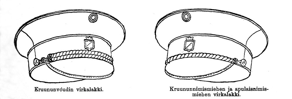 Kruununvouti, kruununnimismies ja apulaisnimismies ovat oikeutetut virantoimituksessa ja sen ulkopuolella käyttämään mustasta verasta tehtyä lippalakin muotoista virkalakkia, jossa paarteen ylä- ja alareuna sekä lakin päällisen yläreuna on varustettu vaaleansinisellä reunuksella; lippa on mustasta kiiltonahasta; paarteen etupuolella on hopeanvärinen lääninvaakuna sekä lakin päällisessä etupuolella sinivalkoinen pyöreä kokardi. Kruununvoudin lakissa on lipan yläpuolella kaksi 7 mm. leveätä hopeapalmikkoa, jotka ovat kiinnitetyt kahdella pienellä hopeanvärisellä leijonanapilla, sekä kruununnimismiehen ja apulaisnimismiehen lakissa yksi samanlainen hopeapalmikko samoin kiinnitettynä. Lämpimänä vuodenaikana voidaan käyttää vaaleanharmaasta kankaasta tehtyä lakin päällystä.